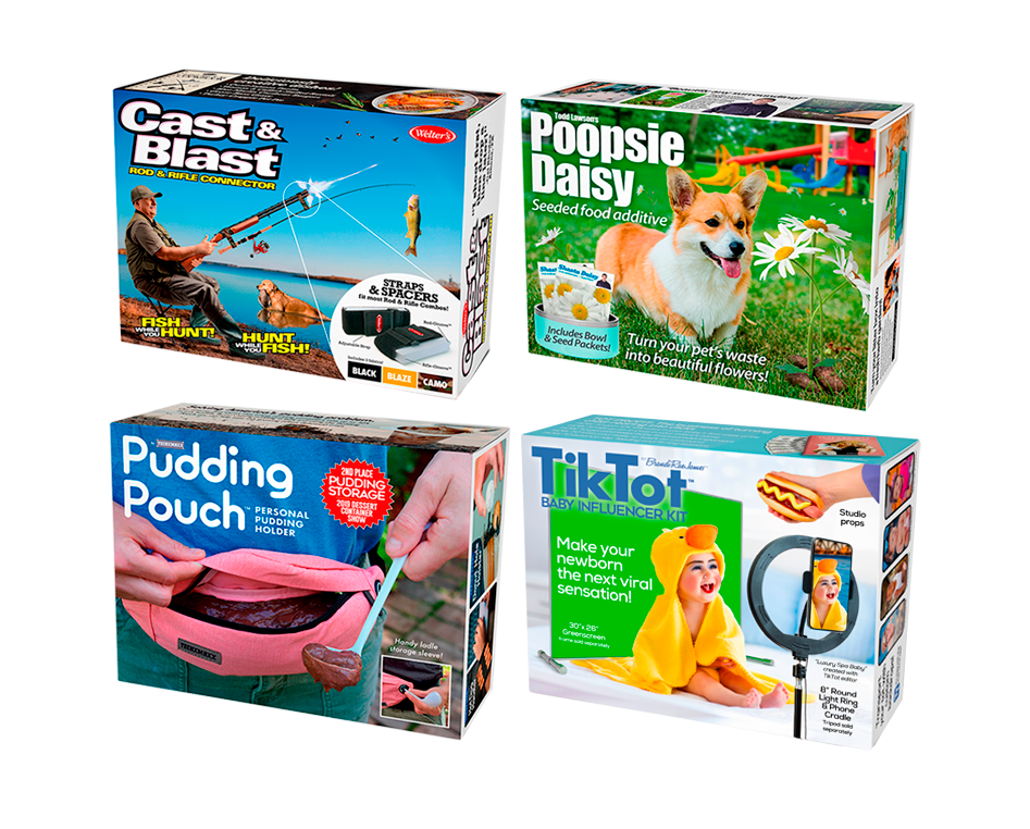 They’re the boxes for screamingly funny, hilariously awful, but scarily plausible products that don’t really exist. The photography, typography and layout of these boxes are perfect. I mean, they look exactly like the cheesiest products you’d buy from TV infomercials."